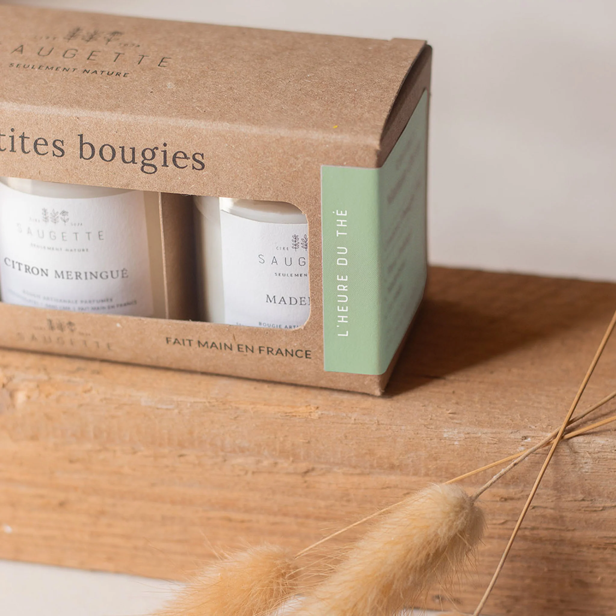 Un coffret à déguster contenant 3 mini bougies aux parfums Chaï latte, Citron meringué et Madeleine pour célébrer l’heure du thé.