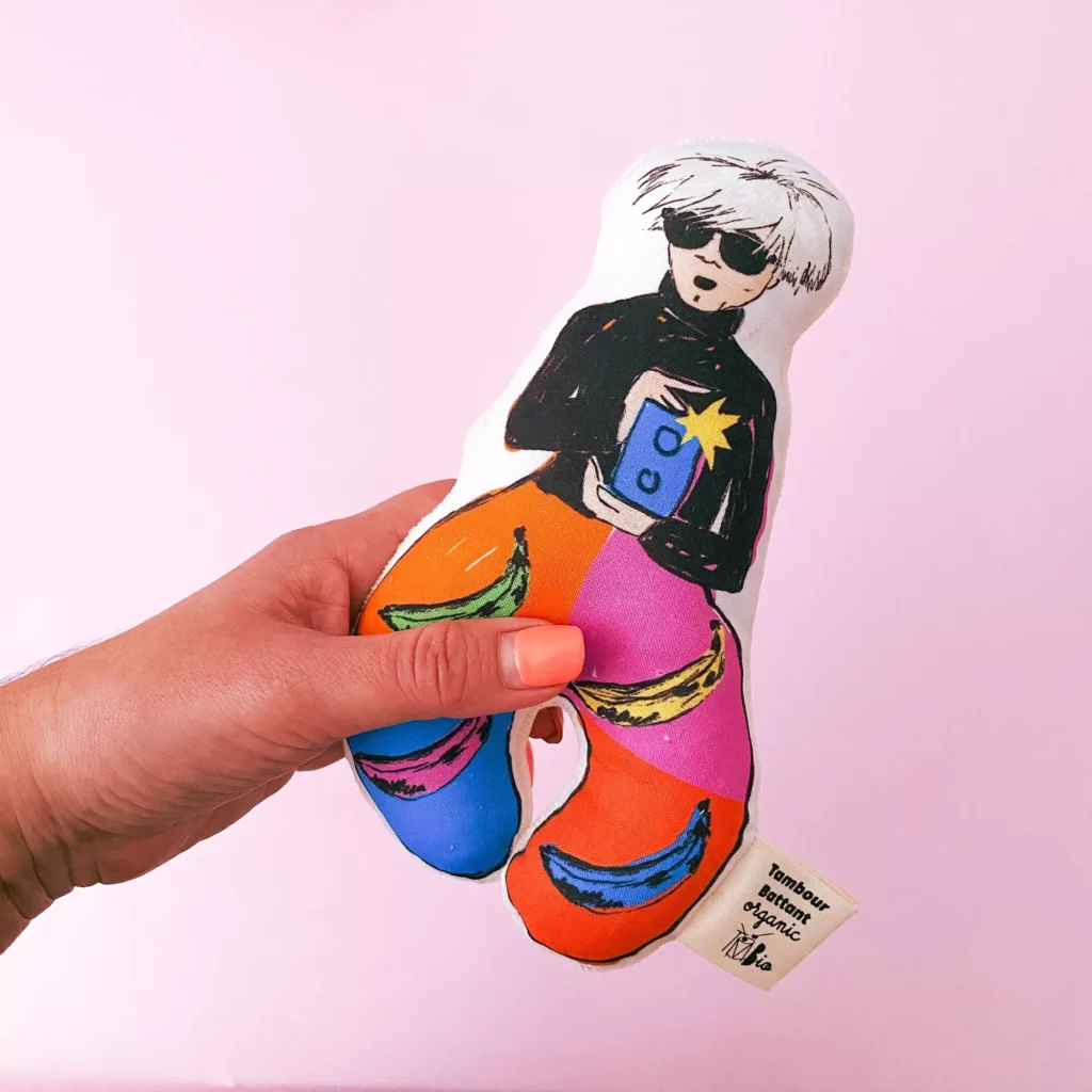 Un hochet tout doux inspiré par le maître du pop art! Fun et coloré, c’est un cadeau de naissance pour tous les artistes en herbe!