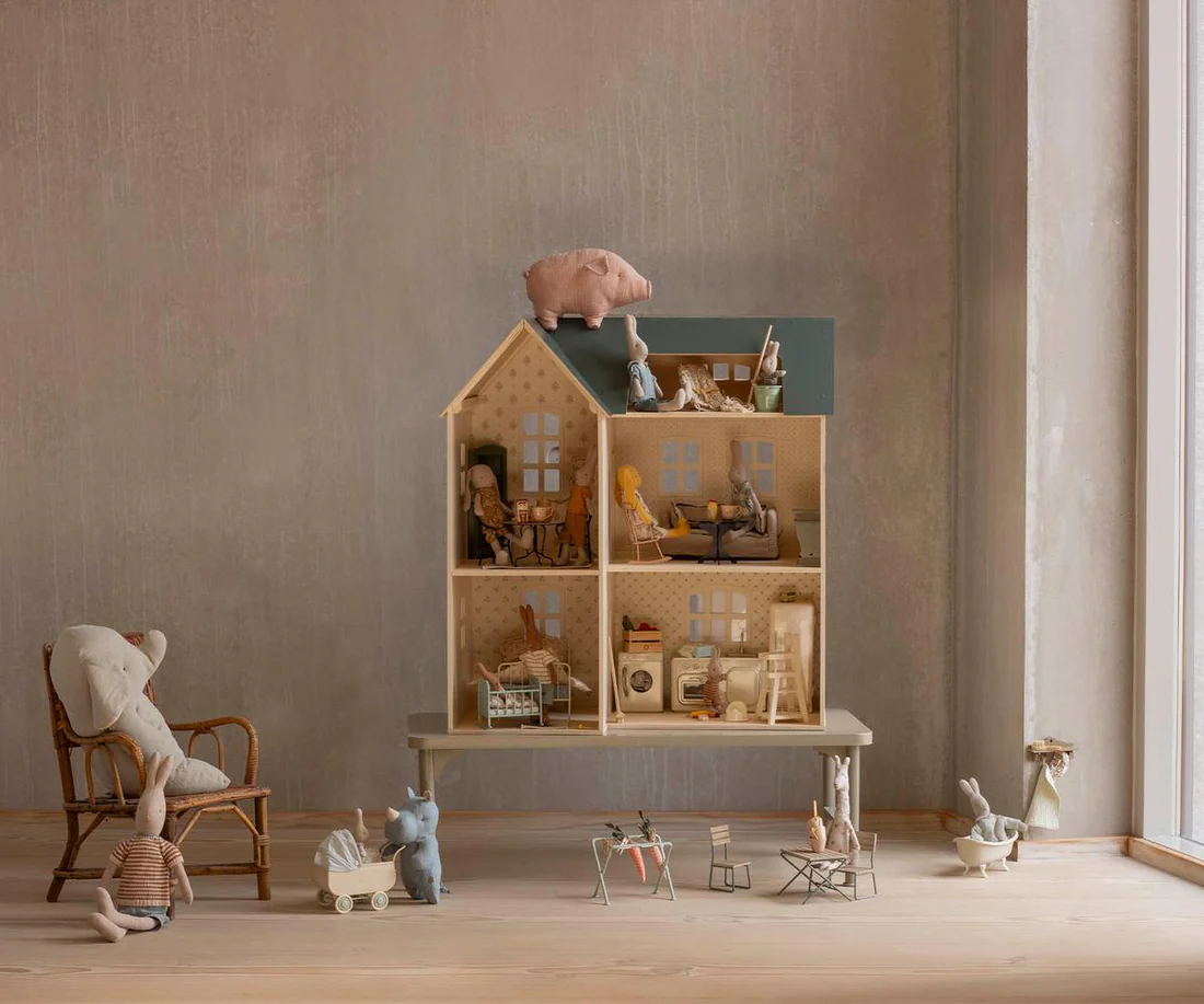 Maison Dollhouse Maileg composée de magnifiques murs décorés. Articles adaptés à cette maison: les lapins de taille 1, 2, Micro et My, les membres de la famille Teddy et les meubles & accessoires de taille Miniature (convient aussi aux souris bien sûr!)