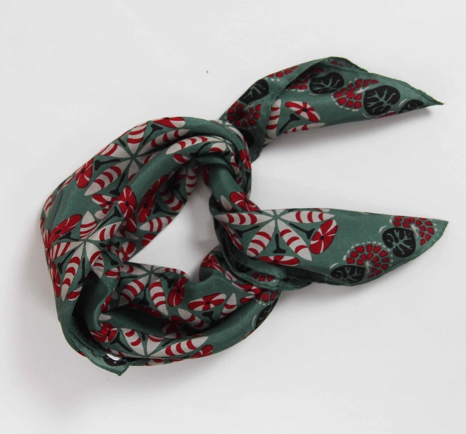 Une ribambelle de feuilles encadre ce tableau floral nommé Idole, ce mini foulard en soie se porte noué autour du cou, en bandeau dans les cheveux ou au poignet comme un bijou!