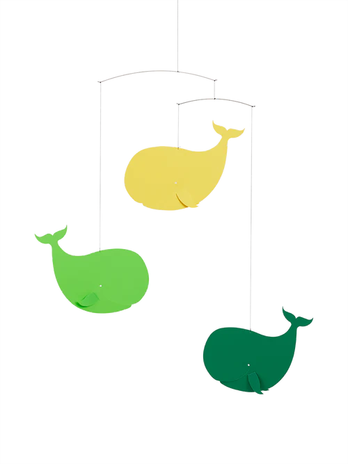 Happy Whales | Yellow & Green est un mobile pop avec trois baleines souriantes aux couleurs vives. Facile à installer et sensible au moindre souffle, ce mobile permet d’éveiller bébé comme de faire rêver les plus grands… Un très beau cadeau de naissance, original et durable, qui pourra être installé à différents endroits de la maison au fil des années. Comme tous les mobiles Flensted il a été réalisé à la main à Copenhague.