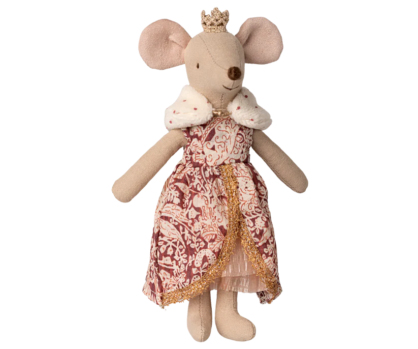 La Reine Souris de taille Maman (15cm) est prête à recevoir ses invités pour une célébration au château. Elle porte une magnifique robe fleurie et une couronne, et s’adapte parfaitement au Hall du château.
