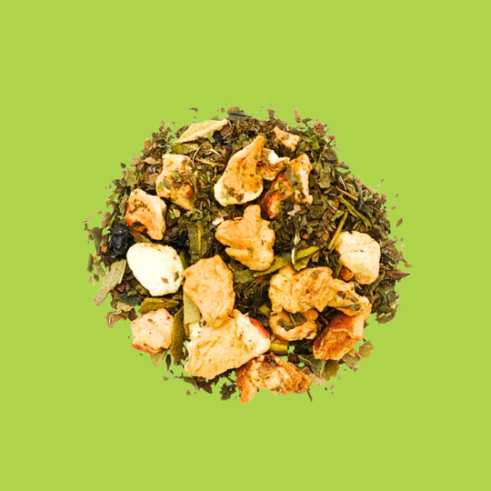 Ingrédients : Pommes*, thé vert sencha* (10%), menthe* (8%), écorces d’orange* (6%), eucalyptus*, baies de sureau*, arôme naturel d’orange